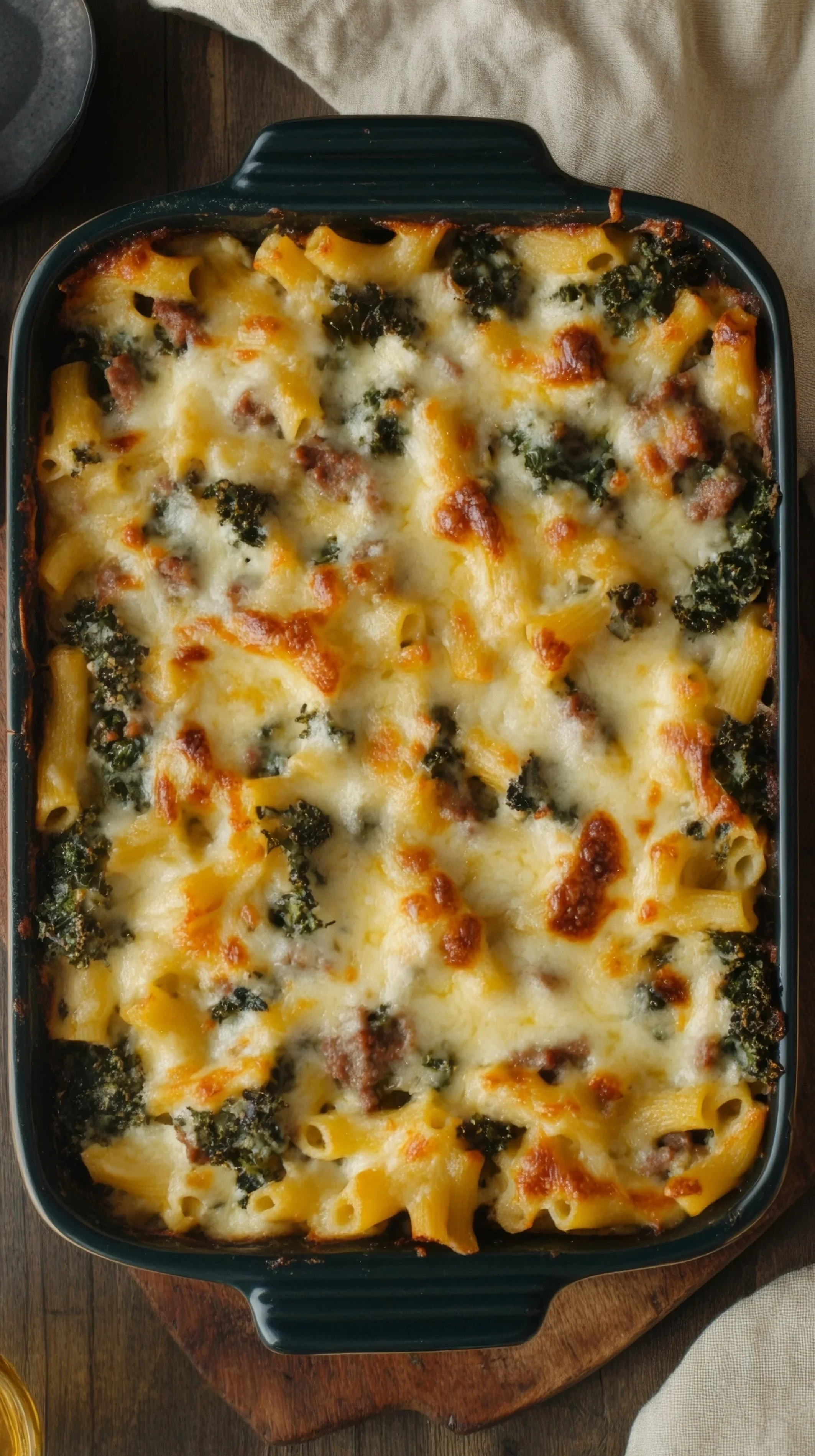 In a large mixing bowl, combine the cooked pasta, sausage mixture, ricotta, half of the mozzarella, and the Parmesan. Mix until evenly coated.Bake: